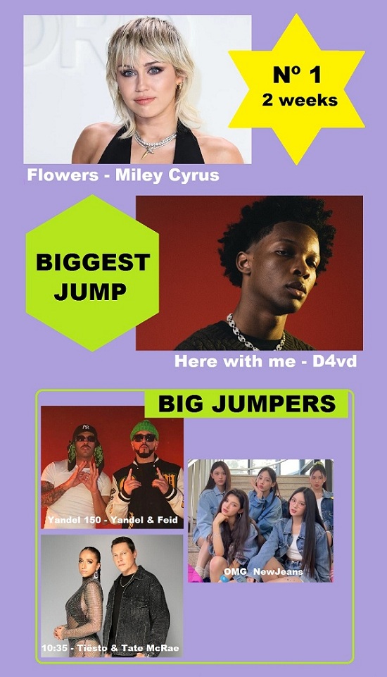 Kokkara, el tema principal del dorama Passion for Punchlines, se convierte en la mejor entrada de la banda japonesa SixTONES en el Top 40. Entretanto, Flowers de Miley Cyrus, empieza su carrera por destronar a los sencillos que han ocupado el mayor número de semanas en la primera posición de este chart.
